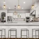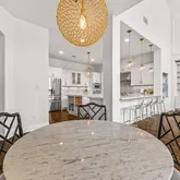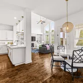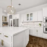- Room Description: Stylish chef's kitchen featuring a GE Monogram 6-burner gas cooktop and other high-end appliances. It includes a cozy coffee nook, glass-front cabinetry, and a large island with a bookshelf end and breakfast bar. The kitchen is open to the family room and breakfast area, making it light and bright.