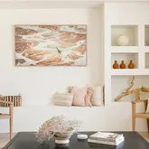 Step inside to discover a dining room that flows seamlessly into an open-concept chef's kitchen, featuring smooth plaster walls, a limestone backsplash, and Zia tiles. The custom resin countertops are as functional as they are beautiful, while dimmable recessed lighting throughout the home creates the perfect ambiance. The living room boasts custom lit wall niches, ideal for showcasing your favorite art pieces, and a gallery-framed TV ready to display your chosen masterpiece. Designed with gatherings in mind, the communal living spaces are perfect for hosting friends and family.