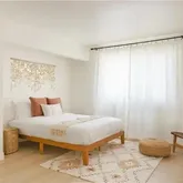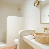 The home features two luxurious bathrooms, each finished in polished cement with unique rock sink bowls that bring the outdoors in. Chevron clay tiles elongate the space, adding a touch of earthiness. With updated plumbing and electrical systems, this home is as modern as it is timeless.
