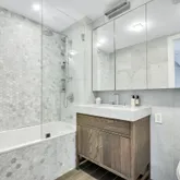 The master bedroom is very well proportioned with oversized windows and a large custom closet. The bathroom is adorned with a gleaming white Carrara marble wall and vanity, Mirage floor tiles imported from Italy and a deep-soaking Kohler bathtub and shower.
