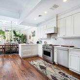 Gorgeous sunlight, custom finishes and lovely millwork abound between tall, beamed and coffered ceilings and superb wide-plank flooring. It’s only one flight up to the main floor where you can enjoy the inviting and serene rear-facing living room lined with substantial built-ins and French doors leading to the rear deck with access to a fenced, shared garden below. The large kitchen is both incredibly charming and professionally equipped with rows of country cabinetry and dramatic octagonal tile backsplash surrounding top-notch stainless steel appliances. The adjacent dining room feels like a warm sunroom with large west-facing windows, and counter seating provides the perfect setting for casual dining.