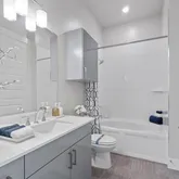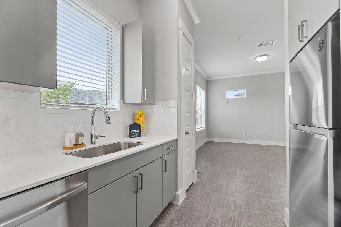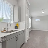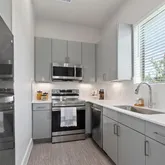 Modern Tile Backsplash, Under-Cabinet Lighting, Pantries with Built-in Shelves, Stainless-Steel, Under-Mount Kitchen Sink with Retractable Faucet, Dual Sinks, Garden...1 bed, 1 bath, with attached garage. Private Fenced-In Yards & Covered Patios with Weekly Lawn Care Included in lease. First-Floor Entrance with No Adjoining Homes Above or Below, Doggie Doors available in some units, Wood Plank-Style Flooring, Tall, Expansive Windows, 2-Inch Custom Window Treatments, Quartz Countertops in Kitchen & Baths