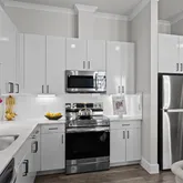 Modern Tile Backsplash, Under-Cabinet Lighting, Pantries with Built-in Shelves, Stainless-Steel, Under-Mount Kitchen Sink with Retractable Faucet, Dual Sinks, Garden Tubs