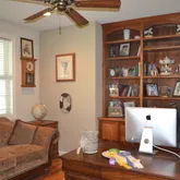Formal dining room is open to living area with arched entryways and large window capturing views. OFFICE/DEN: Located just off the main entry. Two glass doors open to large room with mahogany built in shelving and lower cabinets. Plenty of room for desk and sitting area