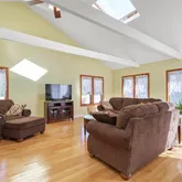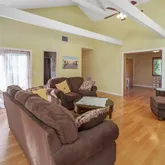 - Room Description: Spacious Family Room with vaulted ceilings and glass sliders leading to full wrap-around porch