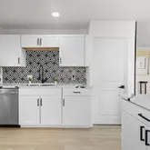 - Room Description: The kitchen features white cabinetry, stainless steel appliances, quartz countertops, and a Basalt Dolomite Geo Mosaic tile backsplash.