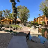Great opportunity for a family, first-time/seasoned investor, ideally located near the Empire Polo Grounds where year-round events help support consistent rental demand and the potential to offset ownership costs. This upgraded 2-bedroom, 2-bath home with approximately 1,000 sq ft features bamboo flooring, custom paint, vaulted ceilings, and a remodeled kitchen with custom cabinetry, solid-surface countertops, and stainless steel appliances. The bright living room opens to a private balcony overlooking serene lakes, streams, and waterfalls, creating a tranquil setting rarely found at this price point. The spacious primary suite offers high ceilings, balcony access, mirrored wardrobes, and an ensuite bath. Additional highlights include in-unit laundry, a one-car garage, and a HVAC system. HOA dues cover gas, water, and trash, and residents enjoy resort-style amenities including a pool, spa, clubhouse, tennis and pickleball courts, scenic walking paths, and beautifully landscaped grounds. Conveniently located near shopping, dining, golf courses, and Highway 111, this home is ideal as a full-time residence, weekend retreat, or investment opportunity in the heart of the Coachella Valley.