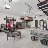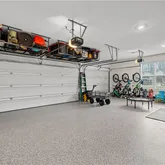 Three-car garage with epoxy-coated floors, custom cabinetry, and ceiling storage