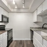 - Room Description: Granite Counters, Built-In Appliances, White Cabinetry, Track Lighting, Wood-Look Floors, Breakfast Counter