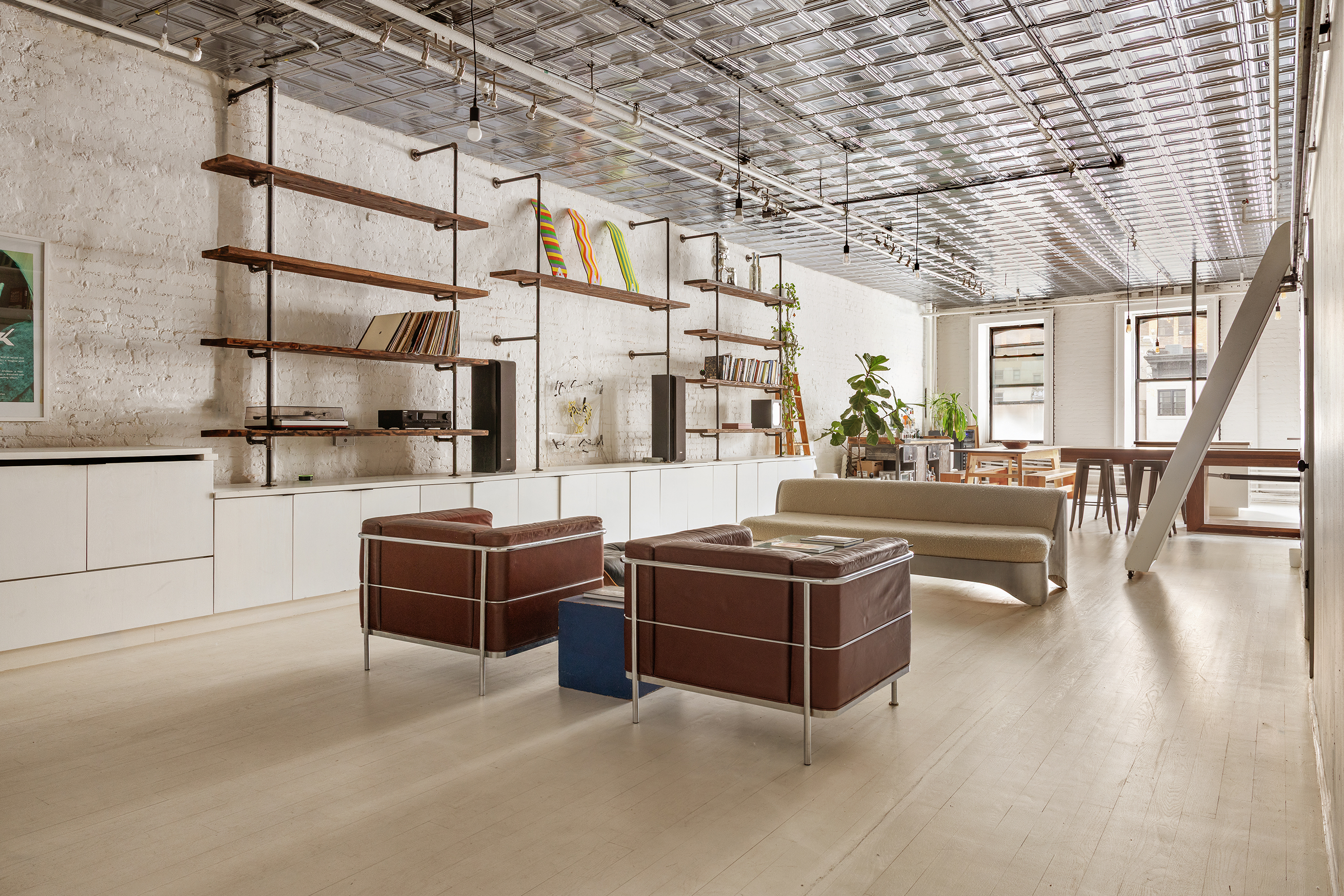 Entering through a gallery-style hallway, the loft opens into a grand living area with nearly 11-foot pressed-tin ceilings, restored hardwood floors, and crisp, whitewashed masonry walls. Industrial pipe shelving adds both function and style, nodding to the building’s creative roots.