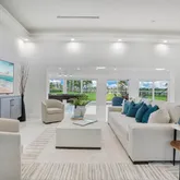Fully redesigned from the studs up in 2023, this 4-bedroom, 4-bath luxury residence blends modern design with functional living. Featuring three private bedroom wings, the layout is ideal for executive stays, families, or multigenerational living. Porcelain tile flows throughout the home, complemented by a dramatic floor-to-ceiling gas fireplace, expansive lakefront windows, and a glass-enclosed office—perfect for remote professionals or medical executives. Chef’s Kitchen & Entertaining Spaces