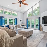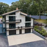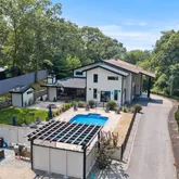 Stunning contemporary on gated lot with water view, countless amenities, and tasteful decor throughout. Modern kitchen with 10-foot island equipped with granite countertops, stainless steel appliances, cooktop, double wall oven, and wet bar with wine refrigerator. Dining room with barn door provides for more formal dining setting. Oversized living room with pellet stove and vaulted ceiling is well-illuminated by French doors and transom windows. Large office with abundance of natural light and built-ins...Stunning contemporary on gated lot with water view, countless amenities, and tasteful decor throughout. Modern kitchen with 10-foot island equipped with granite countertops, stainless steel appliances, cooktop, double wall oven, and wet bar with wine refrigerator. Dining room with barn door provides for more formal dining setting. Oversized living room with pellet stove and vaulted ceiling is well-illuminated by French doors and transom windows. Large office with abundance of natural light and built-ins is ideal setting for remote work. Master bedroom features French doors and balcony, walk-in closet with built-ins, and master bath with Roman shower and rain head system. Additional bathroom has oversized Roman shower, double vanity, and modern soaking tub. Paradise awaits you outside with covered patio, stone bar with built-in appliances/grill, fireplace, TV, hot tub, and decorative lighting all overlooking inground pool. In summary, absolutely beautiful and immaculate!