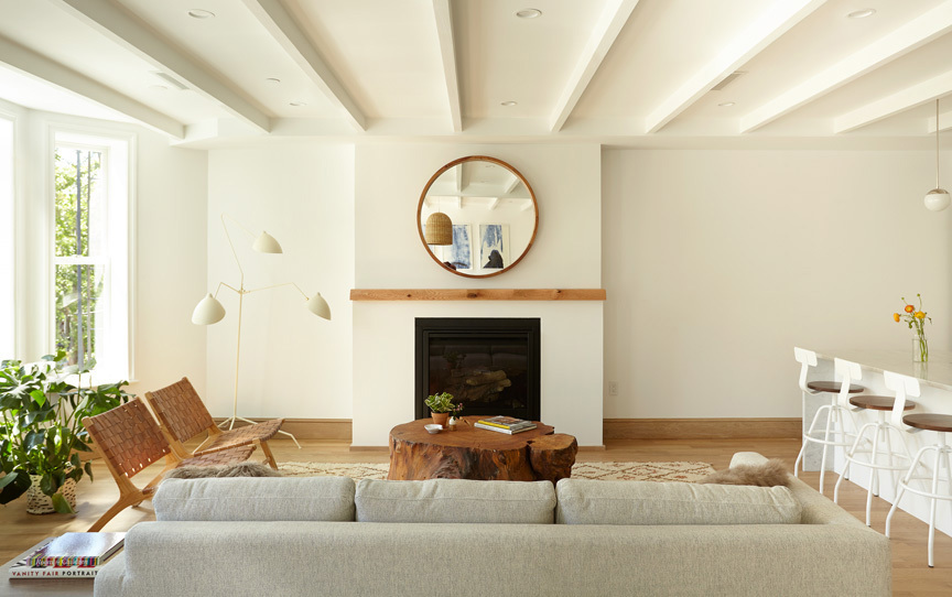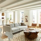 Only one flight up, Unit #2 provides a 40-foot wide living room with gas fireplace, exposed beams and abundant entertainment space. The luxury kitchen is outfitted with a 36-inch six-burner range and dishwasher by Viking, Sub-Zero refrigerator, vented hood, Randolph Morris apron sink and a disposal alongside lighting by Cedar & Moss, honed Carrara marble counters, Shaker cabinets and a walk-in pantry.