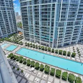 large living room, and floor to ceiling windows, leading to an oversized balcony, with amazing pool, Brickell Key and