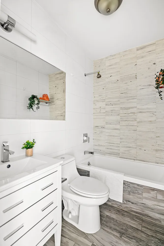 Hardwood floors span the apartment. The front bedroom makes a great office or guest bed. The two back bedrooms are super quiet with garden views. Easily fit queen beds and full furniture sets or even a king size bed and desk in your primary en suite. There’s a balcony with planters off of the en suite for calming coffee breaks. Both bathrooms boast deep soaking tubs, spa shower heads and marble tile.