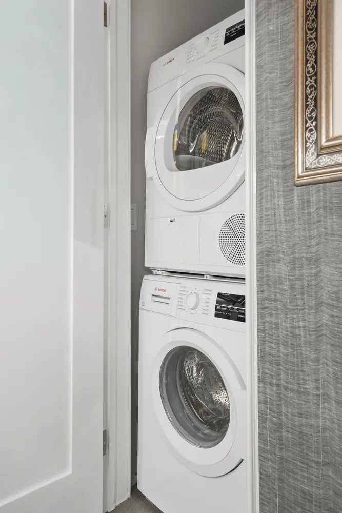 On the opposite side of the apartment, a third bedroom—or ideal home office—also enjoys an en-suite bath, making it perfect for guests or remote work. Adjacent to this space is a true butler’s pantry, offering a highly functional transition area ideal for a coffee station, wet bar, or additional serving and storage space—enhancing both daily routines and entertaining. A newly installed washer and dryer add everyday convenience.