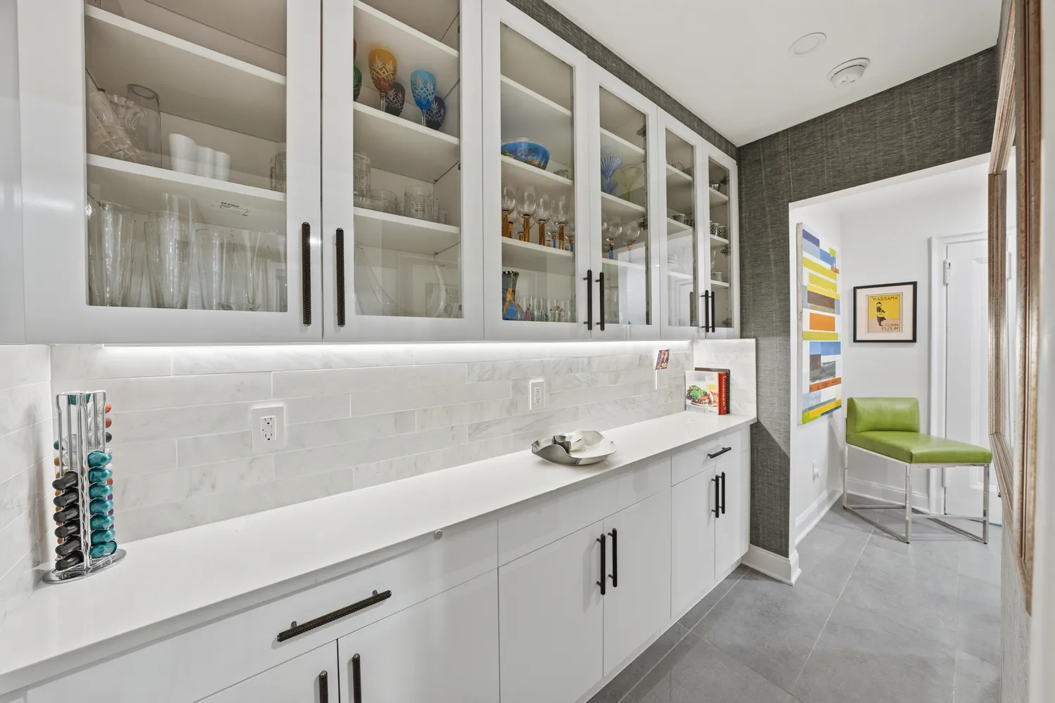 Recent thoughtful enhancements throughout the home include Lutron dimmers and updated electrical work, all-new California Closets for seamless organization, a fireplace insert complemented by new sconces, freshly painted walls, electric blinds for convenience, and tastefully applied wallpaper in hallways area and the office. The kitchen and butler’s pantry have been refreshed with new hardware, glass shelving, and a custom shade, while drapes with coordinating rods add a polished finish throughout. Modern conveniences such as an automatic water sensor shut-off for the washer and TV mounts further enhance everyday living.