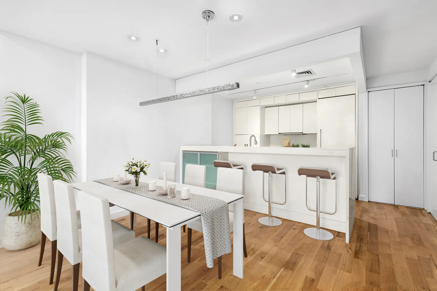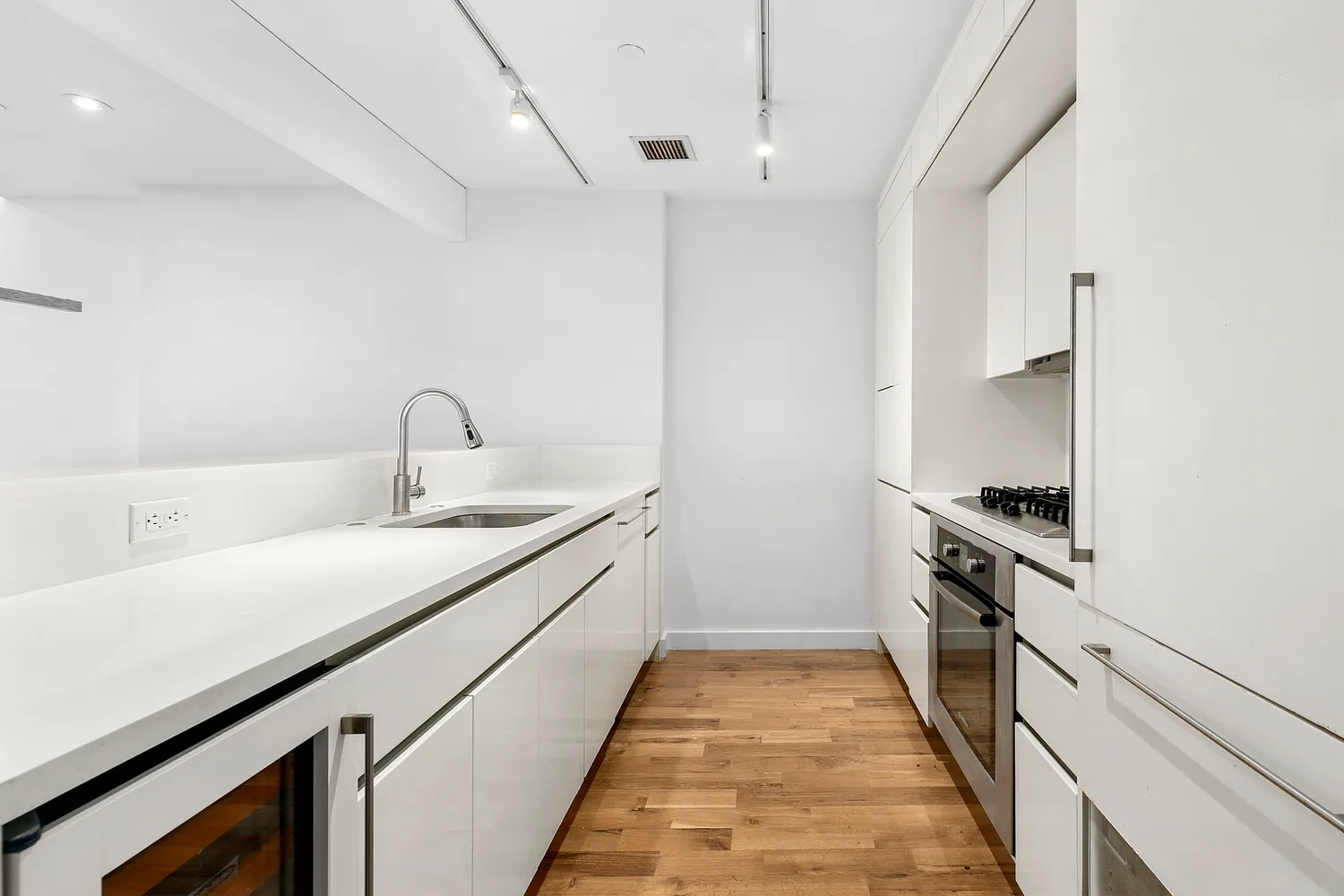 The expansive and combined living and dining room is ideal for entertaining and comfortable living. The open kitchen features custom white lacquer cabinets, Caeserstone countertops, and the best high-end appliance package including a Liebherr fridge, a Bosch range and dishwasher, and a wine cooler.