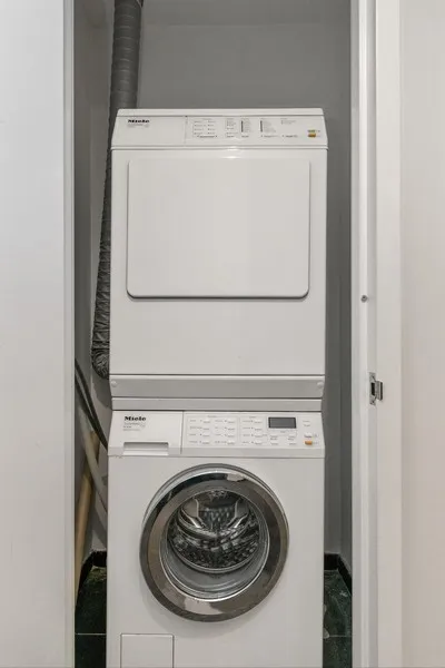 The primary bedroom en-suite bathroom is luxurious and modern with dark oak vanity with double sinks, marble countertops and walls, Zuma deep soaking tub, Glass enclosed shower with rainfall showerhead and Dornbracht polished chrome fixtures. The second bathroom is bright and classic with glossy white wall tile and white polished lacquer vanity. The elegant powder room features a rich palate with an ebonized oak vanity, black marble countertop, slate grey quartzite stone floor and iridescent accent wall. Also included, a Miele washer and fully vented dryer.