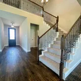 along with 2 person Super Shower with dual rain head and hand held fixtures, plus two benches in the Master bath. The kitchen includes an oversize quartz island and counters, white shaker soft close cabinets and drawers, giving you plenty of storage space. Sleek Brushed nickel hardware on cabinets and drawers and throughout the home, with a impressive staircase with wrought iron spindles. Enter this home by an 8' iron and glass wood front door. A must see location and home, imagine the Oasis you can create in this beautiful backyard.
