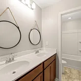 Upstairs, the primary suite spans approximately 15 × 17.5 ft with a walk-in closet and a sitting room that creates a private retreat. The en-suite bath includes a dual vanity, soaking tub, and separate shower. Two additional bedrooms, a loft, and a full bath complete the upper level, offering flexible space for home office, fitness area, or media use. Laundry is conveniently located near the bedrooms for daily ease.