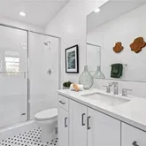 - Room Bathroom Features: Upgraded, Quartz Counters, Shower in Tub, Closet in bathroom, Exhaust fan(s), Walk-in shower, Main Floor Full Bath, Linen Closet/Storage, Low Flow Shower, Privacy toilet door, Double Sinks in Primary Bath, Low Flow Toilet(s), Shower