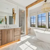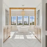 The primary suite on the third level provides cypress vaulted ceilings along with a spa-inspired ensuite bathroom featuring a luxurious soaking tub, an oversized walk-in shower, dual vanities, and elegant designer finishes. The suite also enjoys direct access to a private balcony, perfect for taking in the Gulf breezes and sunset views.