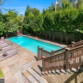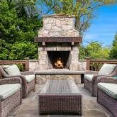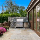 Outside, the home becomes a private resort. French doors lead to a spacious deck with a built-in grill and tree-lined views, perfect for hosting or unwinding. The fully fenced, professionally landscaped yard features irrigation, landscape lighting, and a heated pool with a remote-controlled cover—ideal for summer swims or relaxing on quiet Sundays. A custom stone patio with a wood-burning fireplace provides the perfect backdrop for cozy evenings under the stars.