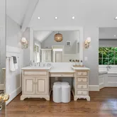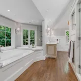 The primary suite is a private sanctuary. With its own fireplace, dual walk-in and cedar closets, and a spa-inspired bath, it’s a retreat designed for true rejuvenation. The dual-sided bathroom is bathed in natural light from a skylight above the soaking tub and includes a private vanity and water closet.