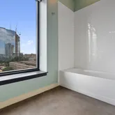 - Room Description: Modern primary ensuite bath; Large glass-enclosed walk-in shower with tile surround; Separate tun with tile surround; Karge arching picture window with city views