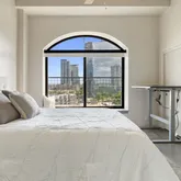 - Room Description: Amazing oversized primary suite; Modern light fixture; Arching picture window with city views and a window seat; Private ensuite bath