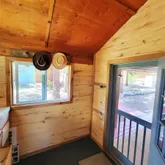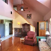log fireplace for those cold winter nights. There is a large covered front deck with removable plastic screens that provide