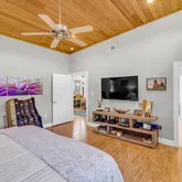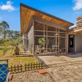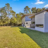 Discover your private retreat just 7 miles from I-10! The main home offers 1,883 sq. ft. with a two-car garage (washer and dryer hookups included), plus a 556 sq. ft. carriage house above—complete with a full kitchen, bedroom and bath, ideal for guests, a VRBO rental, or investment opportunity. This stunning custom-built home masterfully blends modern craftsmanship with natural beauty—designed to bring the outdoors in. Featuring casement ventilation windows, 6-inch exterior walls with open-cell foam insulation, and Cypress tongue-and-groove wood ceilings throughout, every detail showcases thoughtful design and efficiency. Step inside to find elegant porcelain tile flooring, smooth, clear-coated custom cabinetry, and an impressive 4x8 kitchen island—the perfect centerpiece for cooking and entertaining. The open-concept layout flows seamlessly to a 12x12 screened lanai, offering peaceful views and a perfect space to unwind. Relax by the mezzo propane gas see-through fireplace or retreat to a separate living area for quiet comfort., 22K Generac generator, and 500-gallon underground propane tank ensure comfort and peace of mind year-round. Outside, enjoy 4.49 serene acres with approximately ¾-acre contour pond and three versatile outbuildings, all with concrete floors: