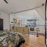 The open living area flows to a private balcony, while a striking iron staircase leads to the luxurious...Experience urban living at its finest in this fully renovated 2-story loft in the historic Tenison Bros. Saddlery building. Soaring 20-foot ceilings, exposed beams, and industrial-style windows create a dramatic backdrop for a sleek, modern design. The chef’s kitchen stuns with a quartz waterfall island, custom cabinetry, stainless steel appliances, and a walk-in pantry—perfect for entertaining.