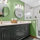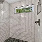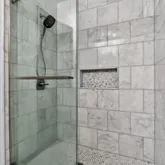 Spacious primary suite with new walk-in tiled shower, double vanity & custom storage (2023)