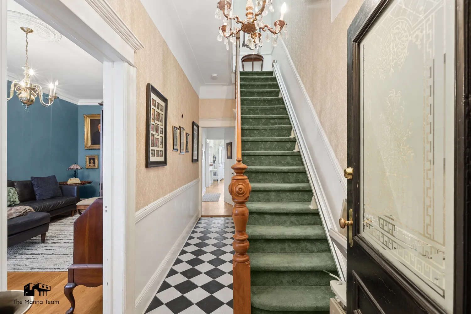 The first floor opens with a stately foyer and hallway that immediately showcase the home's scale and original architectural details. Beyond, a grand living room stretches nearly 24 feet in length, setting the tone for the rest of the home. The library, along with the second-floor home office, features stunning stained glass panels that softly filter light between rooms. The rear kitchen offers a charming pass-through window overlooking the dining room and a classic swinging door, a nod to the home's pre-war heritage that is as functional as it is full of character. Through the rear door, step out onto the terrace and garden beyond, providing generous outdoor space on this deep 100-foot lot. A full bathroom with shower sits conveniently off the main hall.