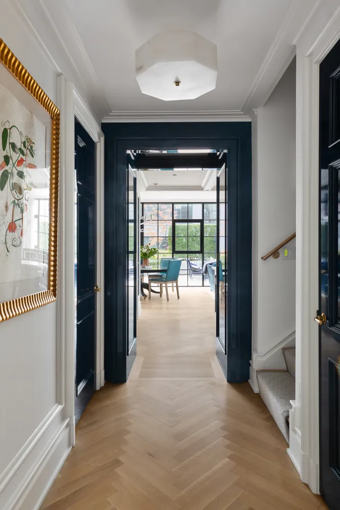 The home’s transformation showcases exquisite materials and thoughtful details, from white oak herringbone floors and lacquered glass-trim pocket doors to brass fixtures, French-inspired moldings, and graceful archways.