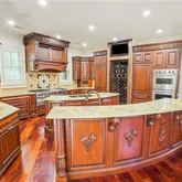- Kitchen Features: Breakfast Bar, Cabinets Stain, Eat-in Kitchen, Kitchen Island, Second Kitchen, Solid Surface Counters, View to Family Room, Wine Rack