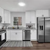 - Kitchen Features: Cabinets White, Stone Counters, View to Family Room