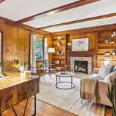 At the center, the skylit kitchen with breakfast nook provides all the essentials, plus an adjacent laundry room for convenience. A distinguished library with a striking stone fireplace and side built-ins offers a serene retreat, perfect for quiet reading or working from home.