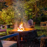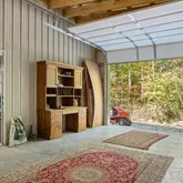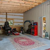 The property also includes a 30' x 46' workshop with roll-up doors, a loft, and a 400-amp panel in both the workshop and home, along with a 240-volt EV plug. An additional hobby room is located near the firepit, while another storage shed with antique doors houses garden equipment. Trails weave through the acreage, one leading down the holler to a picnic table by the creek.