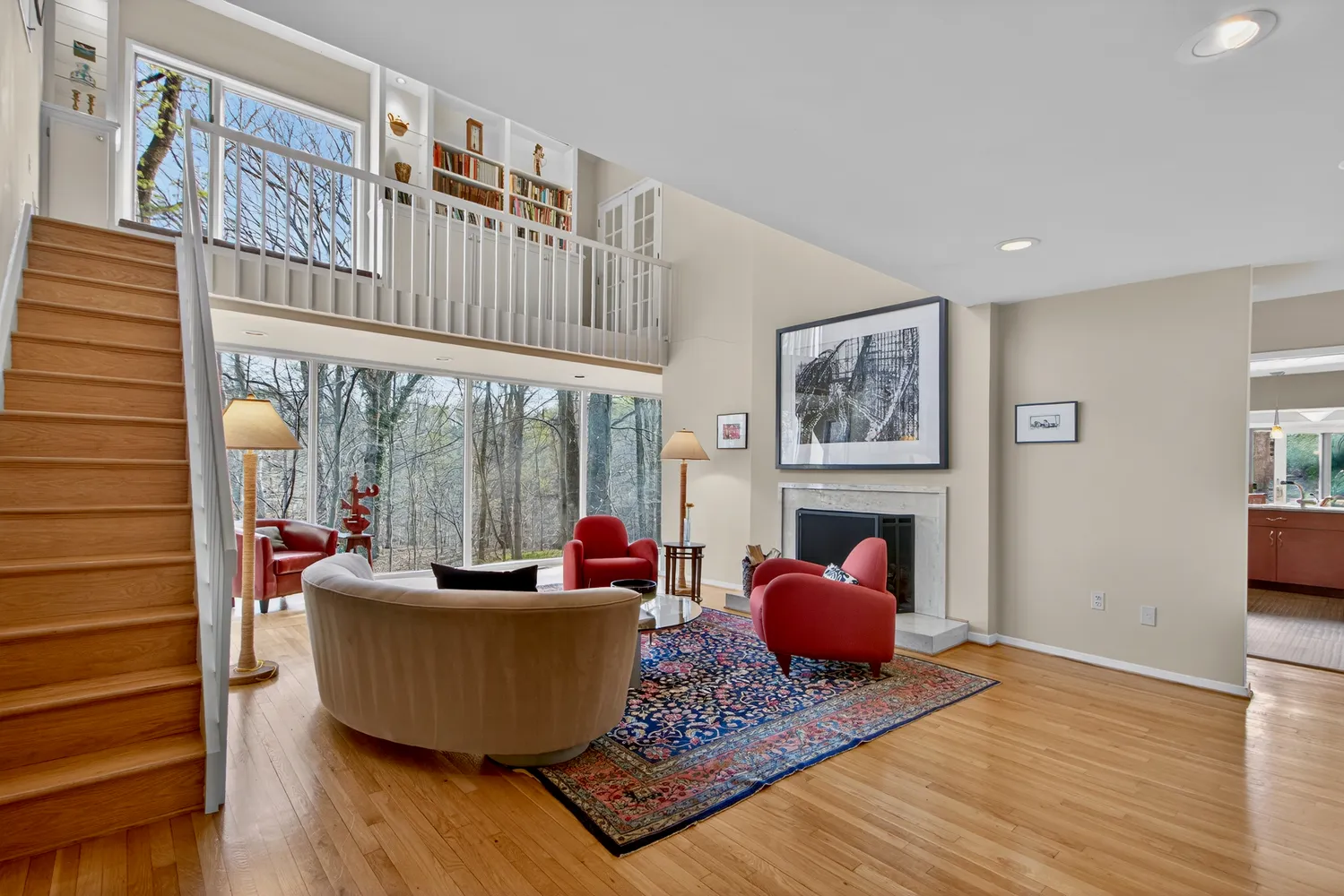 A dramatic, slate-floored atrium introduces the home, setting the tone for what follows. Volumes open, ceilings rise, and natural light pours in from expansive walls of glass. The living room, with its soaring proportions and fireplace, feels both grand and intimate, while framing uninterrupted, breathtaking views of the park beyond. Throughout, the home balances openness with purpose, creating a seamless flow ideal for both everyday living and elevated entertaining.