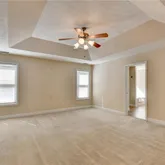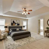 Owner’s suite with tray ceiling and double vanity