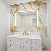 - Room Description: Single sink vanity, LED mirror, shower and toilet.