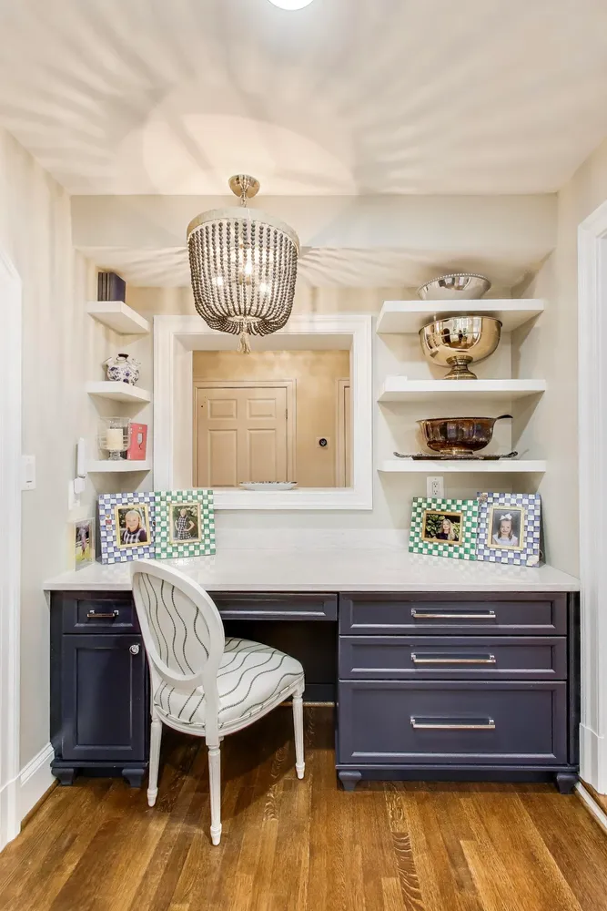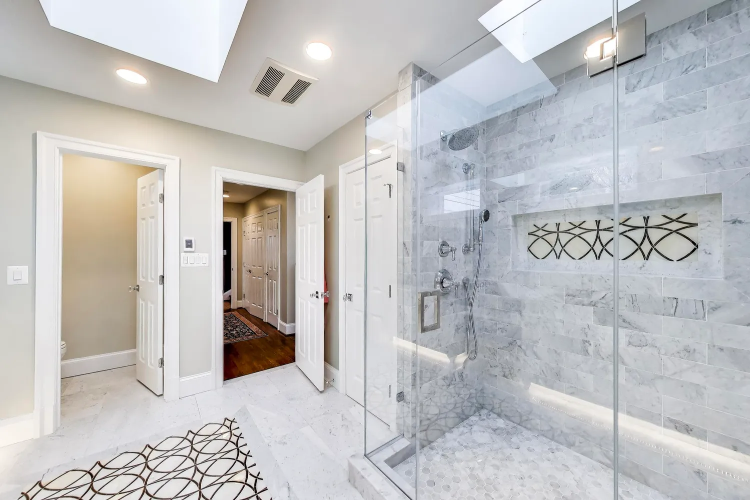 The second level is a dedicated sanctuary, featuring a sprawling primary suite anchored by a cozy fireplace and a private office space with vaulted ceilings. This retreat is completed by dual walk-in closets, a convenient laundry area, and a renovated marble bathroom. Two additional bedrooms are located on this floor, served by a hallway bathroom that features a dual-sink vanity and elegant marble-tiled floors and shower. Moving to the third floor, you will find two more spacious bedrooms and another full bath, offering plenty of room for family or guests.
