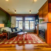 - RoomDescription: Gas fireplace with built-in oak book shelves.