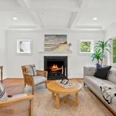The kitchen is a chef’s dream: gleaming quartz countertops, state-of-the-art appliances, a custom center island with a breakfast bar and pendant lighting, and a sun-drenched breakfast area. Open to the family room featuring a gas fireplace and coffered ceiling, this area flows effortlessly out onto the rear deck with views of mature trees and a beautifully landscaped, fully fenced-in backyard.