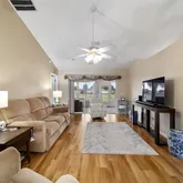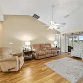 a dining room off the living room which features a large arched window and...You can't find a better view when entering this welcoming home in the 55+ gated golf community of Ocala Palms. This home features 3 bedrooms