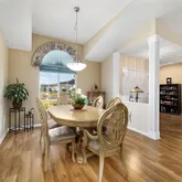 a dining room off the living room which features a large arched window and wood floors. The kitchen has ample space for any chef with plenty of