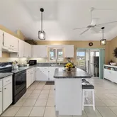 counter space. The middle island can be moved to any location in the kitchen for when you need more space for entertaining friends and family. The kitchen also has sliding glass doors to the enclosed back porch. The sizable master bedroom features 2 walk-in closets and en suite master